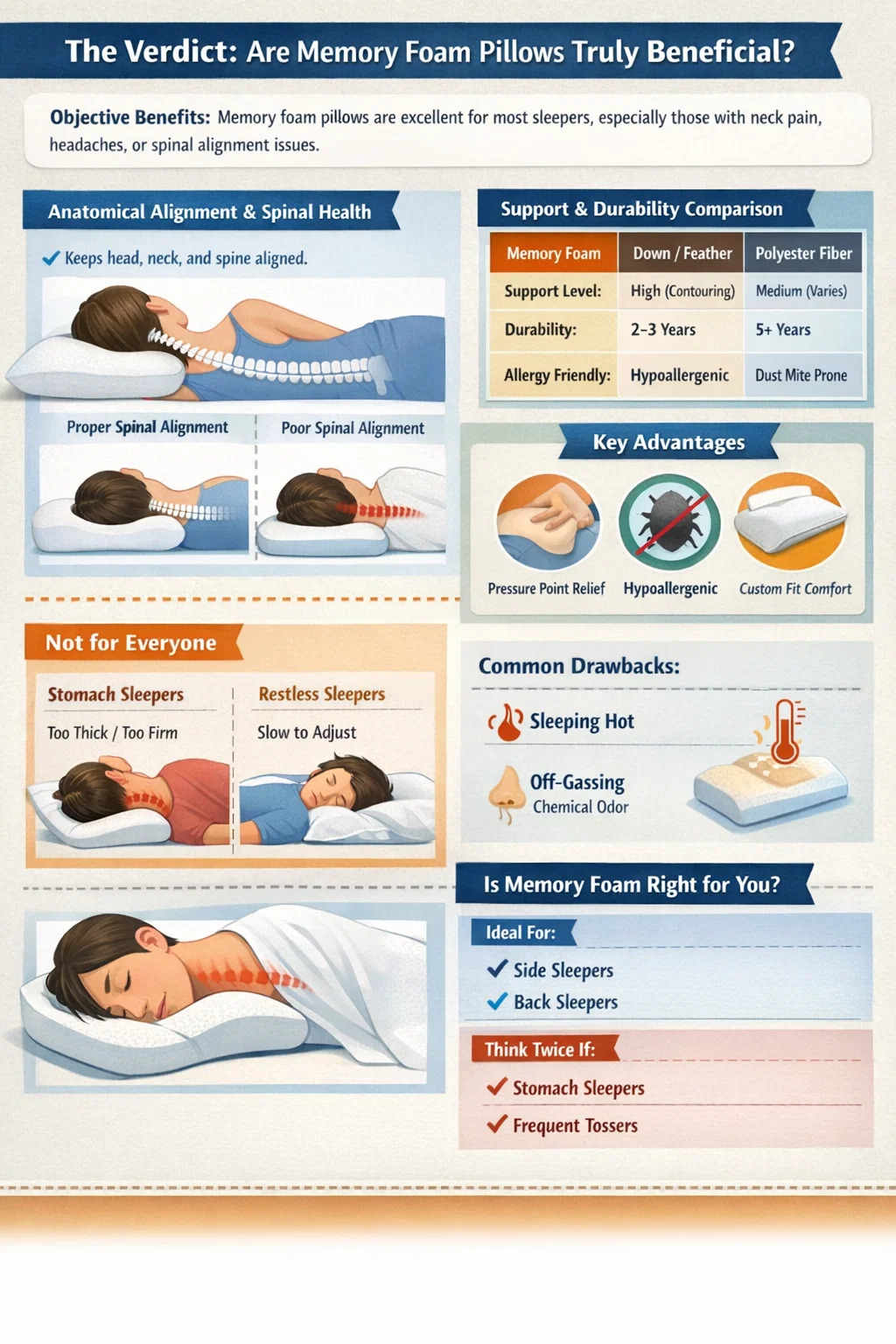 I když nabízejí významné ortopedické výhody, nejsou univerzálním všelékem. Jejich „dobrota“ závisí do značné míry na vaší osobní poloze při spánku, toleranci tepla a citlivosti na pachy materiálu. Pro spaní na boku nebo na zádech může být polštář z paměťové pěny transformační nástroj pro spánkovou hygienu , zatímco žaludeční spánek by je mohl považovat za příliš omezující nebo pevné.