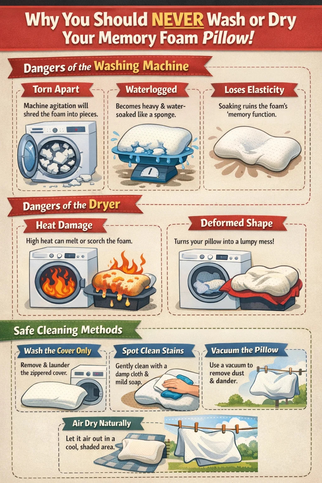 Přímá odpověď zní: Rozhodně to nedělejte! Při házení svého polštář z paměťové pěny Přímo do pračky a sušičky se může zdát snadné a hygienické, tato akce je prakticky „zavražděním“ vašeho polštáře. Zde je důvod, proč byste se měli rozhodně vyhnout těmto dvěma strojům a některým spolehlivějším metodám čištění: