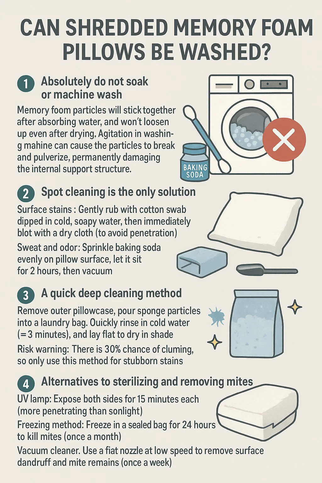 Odstraňte vnější polštář a nalijte částice houby do prádelny. Rychle opláchněte studenou vodou (≤ 3 minuty) a položte naplocho, aby vyschli ve stínu (nevystavujte přímému slunečnímu záření nebo bubnu).