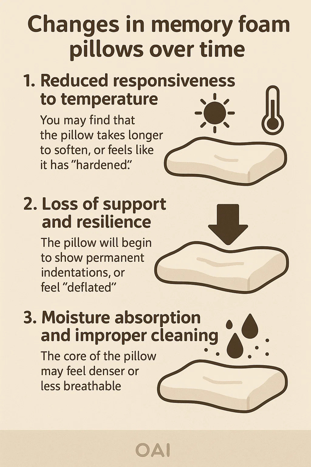 Pokud je polštář vyčištěn nesprávně (např. přímo do pračky) nebo je delší dobu v prostředí s vysokou vlhkostí, může tato vlhkost a nečistoty ovlivnit vnitřní strukturu paměťové pěny.