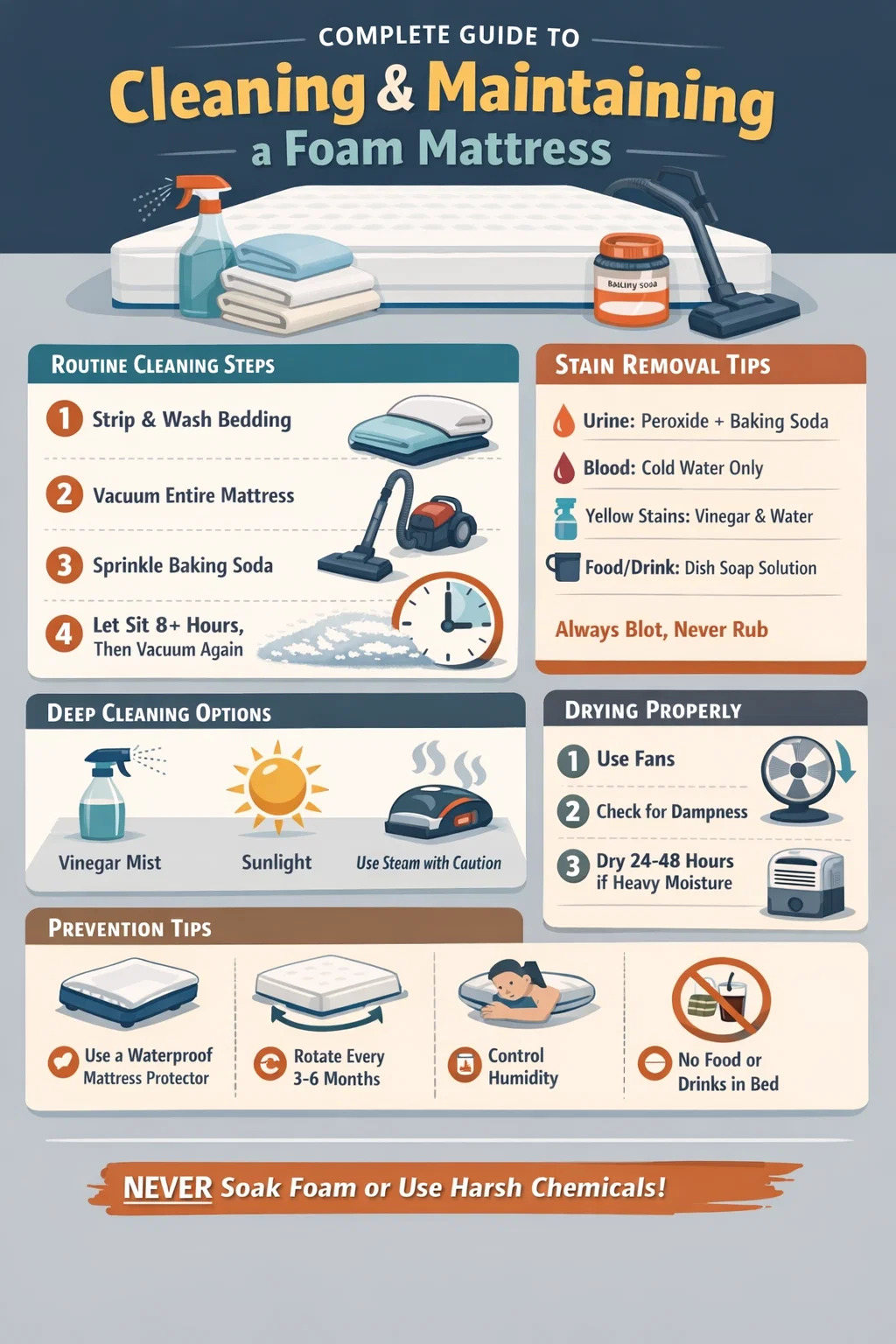 - Ignorování pokynů výrobce k péči: Některé matrace z paměťové pěny používají specifické proprietární složení pěny, které může mít jedinečné požadavky na péči. Před prvním použitím jakékoli metody čištění vždy zkontrolujte štítek s údržbou nebo webovou stránku výrobce.