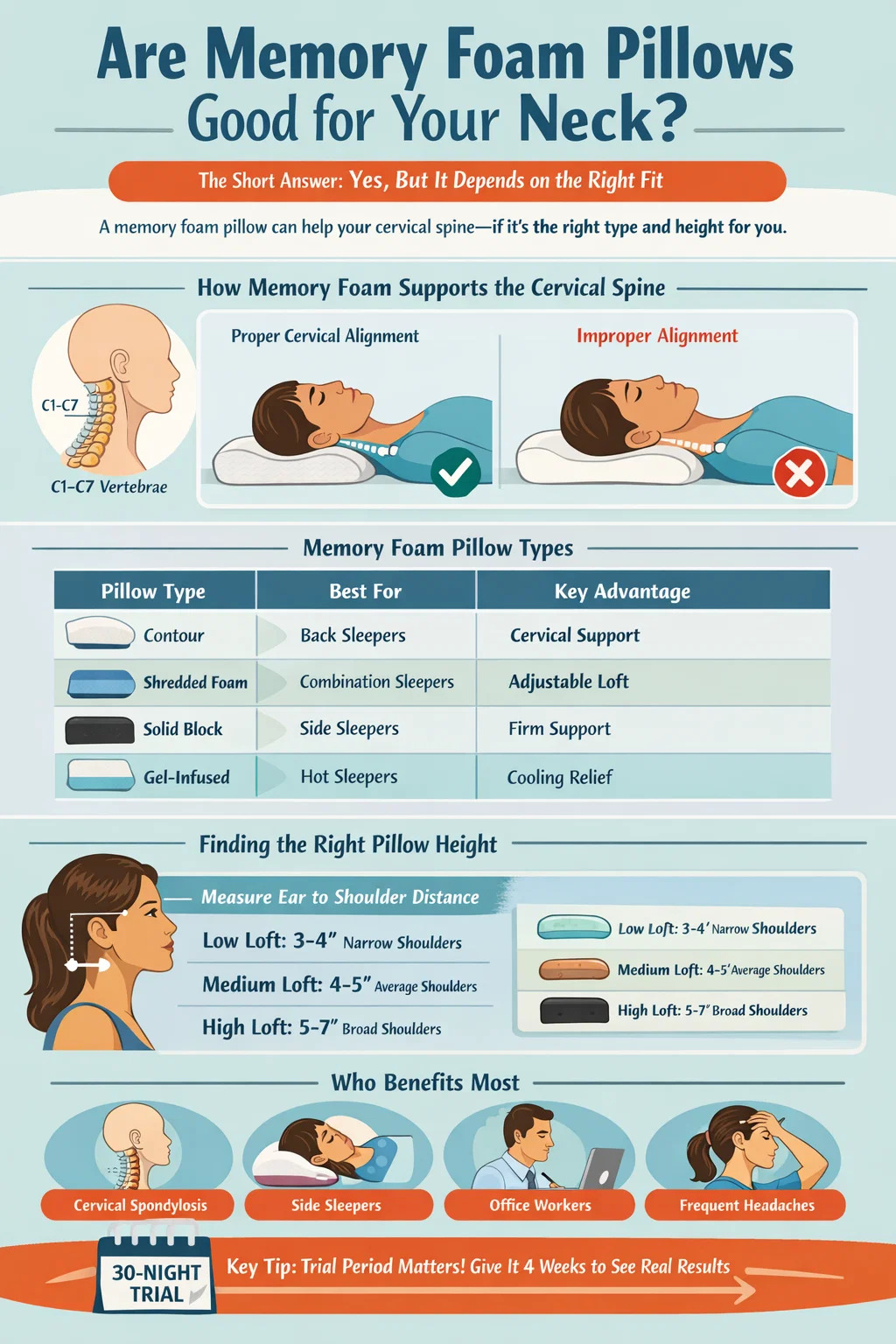 Polštář z paměťové pěny může být skutečně prospěšný pro krční páteř – ale pouze tehdy, když odpovídá vaší poloze při spánku, velikosti těla a specifickému stavu krku. Toto není univerzální řešení. Materiál sám o sobě není magie; Paměťová pěna funguje díky její schopnosti přizpůsobit se přirozené křivce vašeho krku a redistribuovat tlak pryč od citlivých obratlových kloubů. Studie ukázaly, že nevhodná výška polštáře je jednou z hlavních příčin chronické bolesti krku a adaptivní struktura paměťové pěny to pomáhá řešit tím, že odstraňuje mezery mezi krkem a povrchem na spaní, které tradiční polštáře často zanechávají.
